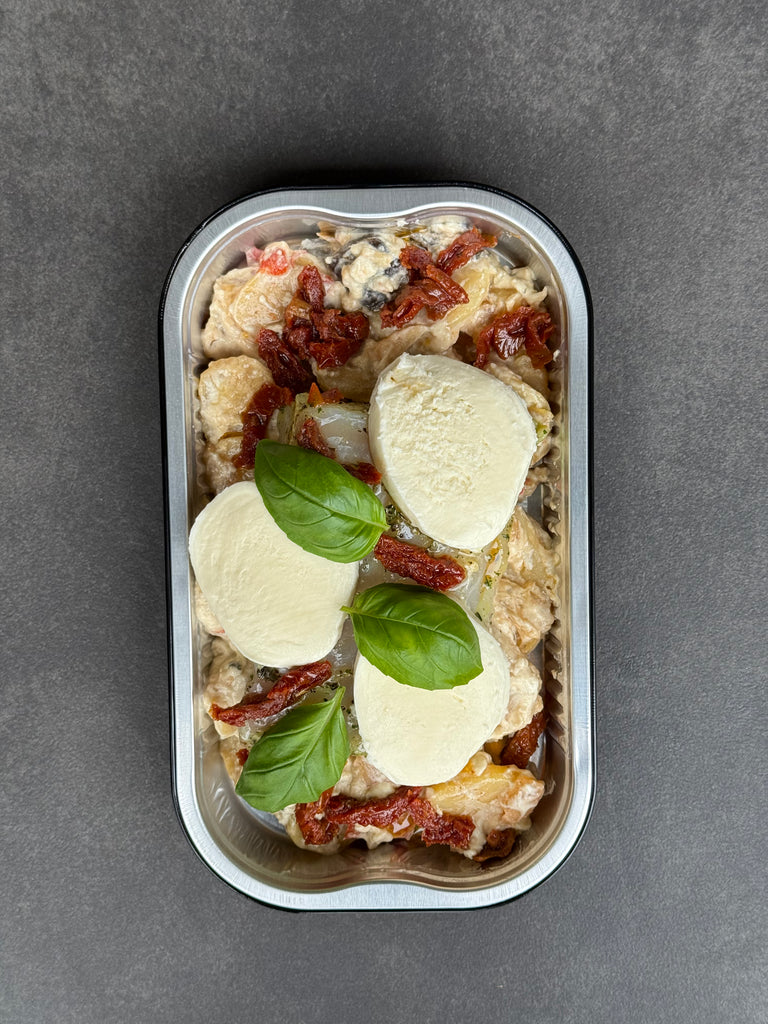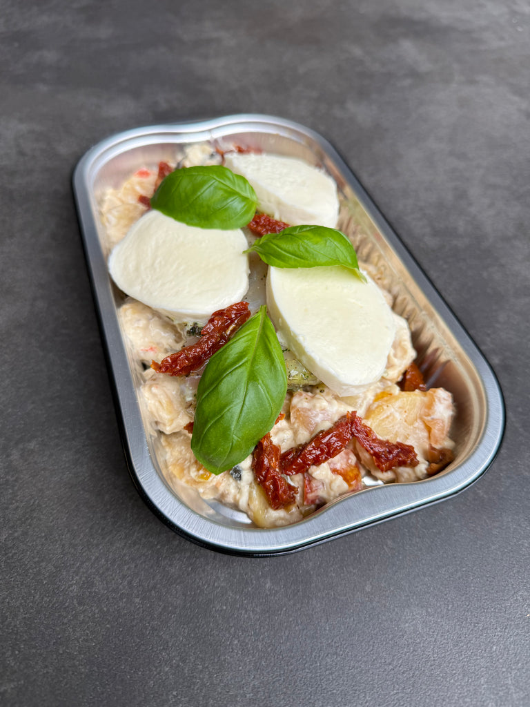 Kant en klare ovenschotel met aardappelgratin met gegrilde groenten, kabeljauw in pesto, mozzarella, zongedroogde tomaat en basilicum.